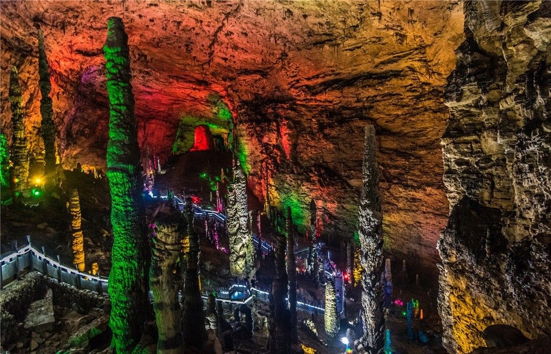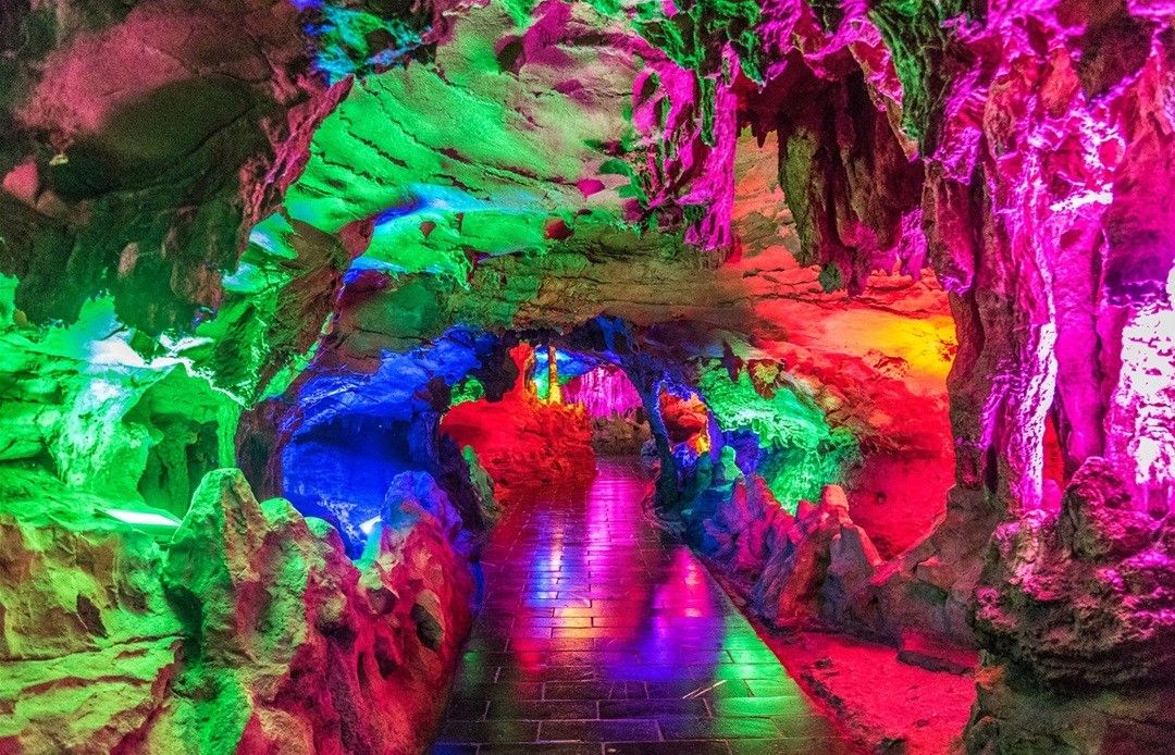 黄龙洞分旱洞和水洞,共四层,洞中有洞,洞中有河,像溶洞标配的石笋、石柱、石钟乳更是随处可见。